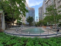 場兩邊角位為斜路上落路段,初學者需特別小心,有2個2.5米闊的出入口,場中畫有一個羽毛球場,油漆欄杆高1米,場邊有4張石座位 |